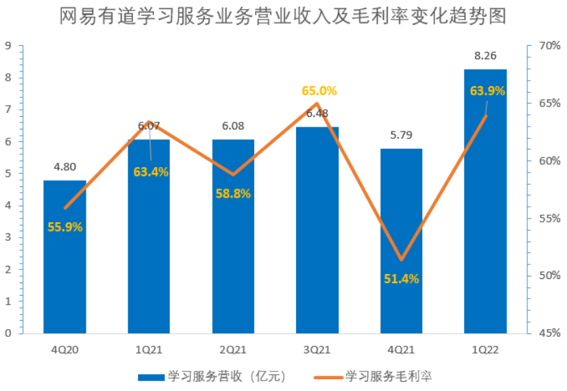 其中,受活躍用户數增長的拉動,網易有道一季度學習服務淨收入為8.26億元,同比增長36.1%,學習服務業務毛利率達到63.9%,同比上漲0.5個百分點,環比增加12.5個百分點,並且重回60%上方。