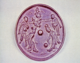 傳説蹴鞠起源於遠古的黃帝時代,是黃帝為訓練軍士而發明的,當時踢的球有可能是石球。在更早的新石器時代的墓葬中,就常發掘出磨得光滑規整的石球。在西安半坡發現的一座少女墓葬中,有三個石球就放在她腳邊。3000 多年前的殷商時代,人們曾採用一邊跳舞一邊踢球的方式求雨。到戰國時民間開始流行蹴鞠遊戲,齊國都城臨淄有不少百姓以踢球自娛,“其民無不吹竽鼓瑟,彈琴擊築,鬥雞走狗,六博蹋(蹴)鞠者”。