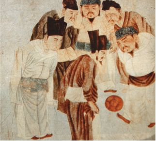 到唐代,蹴鞠有了新的發展。一是出現了“寒食蹴鞠”的民間習俗。每年在寒食節(清明前一天),百姓愛以蹴鞠消閒,個人踢球自娛。對此詩句中有“寒食近,蹴鞠鞦韆,又是無限遊人”,可見蹴鞠和鞦韆是當時人氣最旺的運動項目。二是蹴鞠用的球也有了變化。“八片尖裁浪作球”,兩片皮製的充毛蹴鞠演變為用八片尖皮製的充氣蹴鞠,裏面有球膽,“以胞(動物的尿胞)為裏,噓氣閉而蹴之”。三是漢代的雙球門到唐代演化為單球門(稱為“風流眼”),而且球門被提高,架在三丈高的空中,大小隻有一尺左右,四周有球網。要將球踢進既高又小的球門難度不小。出現這一變化的原因主要是因為這時蹴鞠已由軍事訓練項目演變為娛樂活動,主要供人觀賞,這就要講究技巧。再則充氣球有彈性,便於踢高。存世的《蹴鞠圖譜》對這種單球門比賽有具體的描述:開球先由球頭(隊長)踢起,經過幾腳傳遞再傳給球頭用膝射門,射過球門後對方接住,經過幾次傳遞,再由對方的球頭射門。如果一方射門不進,球撞在網上掉下來,只要不落地,可由守門人接住繼續踢。球員都站在規定的位置上,位於場地正中的球門把雙方分開,與今天的排球比賽規則有幾分相似,但沒有了身體的接觸和碰撞,也就減少了運動的競爭性。