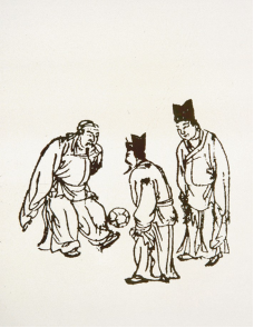 不光是皇帝愛好,不少大臣也有此癖好。宋真宗時期的宰相丁謂擅長蹴鞠,他寫有一首蹴鞠 詩:“背裝花 屈膝,白打大廉斯。進前行兩步,蹺後立多時。”將踢球時的體態動作描繪得很傳神。據説,秀才柳三複得知丁謂常在相府後花園踢球, 便天天去園外等候。終於有一天,丁謂用力過猛,將球踢出牆外,柳三複如獲至寶, 頭頂着球入內求見。只見他納頭便拜,頭上的球即刻轉到肩上、背上,頭抬起時,球又滾到頭巾上,拜揖再三,那球始終在頭、肩、背之間旋轉。丁謂歎為觀止,連連稱讚。柳三複趁機將自己的詩文獻上,被收為門客。