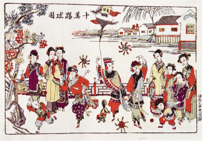 儘管在社會高層不受待見,蹴鞠在元代還是有所發展,主要體現在女性的積極參與。“蹴鞠場中,鳴珂巷裏,南北馳名,寰中可意。款側金蓮,微挪玉體,唐裙輕蕩,繡帶斜飄,舞袖低垂。”元代呂誠《蹴鞠篇和鐵崖先生》詩描寫了女性參與蹴鞠的情景:“江南稚女顏色新,百花樓前蹋繡輪,紅蕖小襪不動塵。不動塵,放嬌態,微風來,舞裙帶。” 民間也以觀看女藝人表演蹴鞠為消閒娛樂,“茶餘飯飽邀故友,謝館秦樓,散閒消愁,唯蹴鞠最風流”。不但有女性的個人表演,還有男女對踢。在一塊元代的銅鏡上可以看到圖案:花園假山前有一對青年男女在面對面踢球,他們身後各有一個侍童、婢女。這説明此時的蹴鞠已以家庭活動為主,參加者偏多女性。到明代情況仍是如此,富貴人家的仕女都是裹足女子,可見這時的蹴鞠已不是一項劇烈運動了。明代小説《金瓶梅》中將蹴鞠稱為“踢行頭”,書中有這樣的描寫:“當下桂姐踢了兩跑下來,使的塵生眉畔,汗濕腮邊,氣喘吁吁,腰肢睏乏,袖中取出春善兒搖涼,……看桂卿與謝希大、張小閒踢行頭。”清初戲劇家李漁有一首《美人千態詩》:“蹴鞠當場二月天,香風吹下兩嬋娟。汗沾粉面花合露,塵拂蛾眉柳帶煙。翠袖低垂籠玉筍,紅裙曳起露金蓮。幾回踢去嬌無語,恨煞長安美少年。”可見這時蹴鞠的參與者是以女性為主。