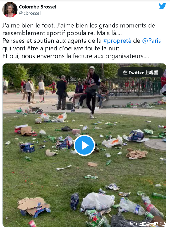 巴黎市政廳主管清潔衞生的助理**科倫布·布羅塞爾(Colombe Brossel)**在推特上寫道:“我喜歡足球。我喜歡大眾在體育活動舉辦時的聚會時刻。但在這裏……請為巴黎市的清潔人員考慮一下,支持一下他們的工作,他們得整夜步行(去處理這些垃圾)。是的,我們會把賬單寄給組織者,”