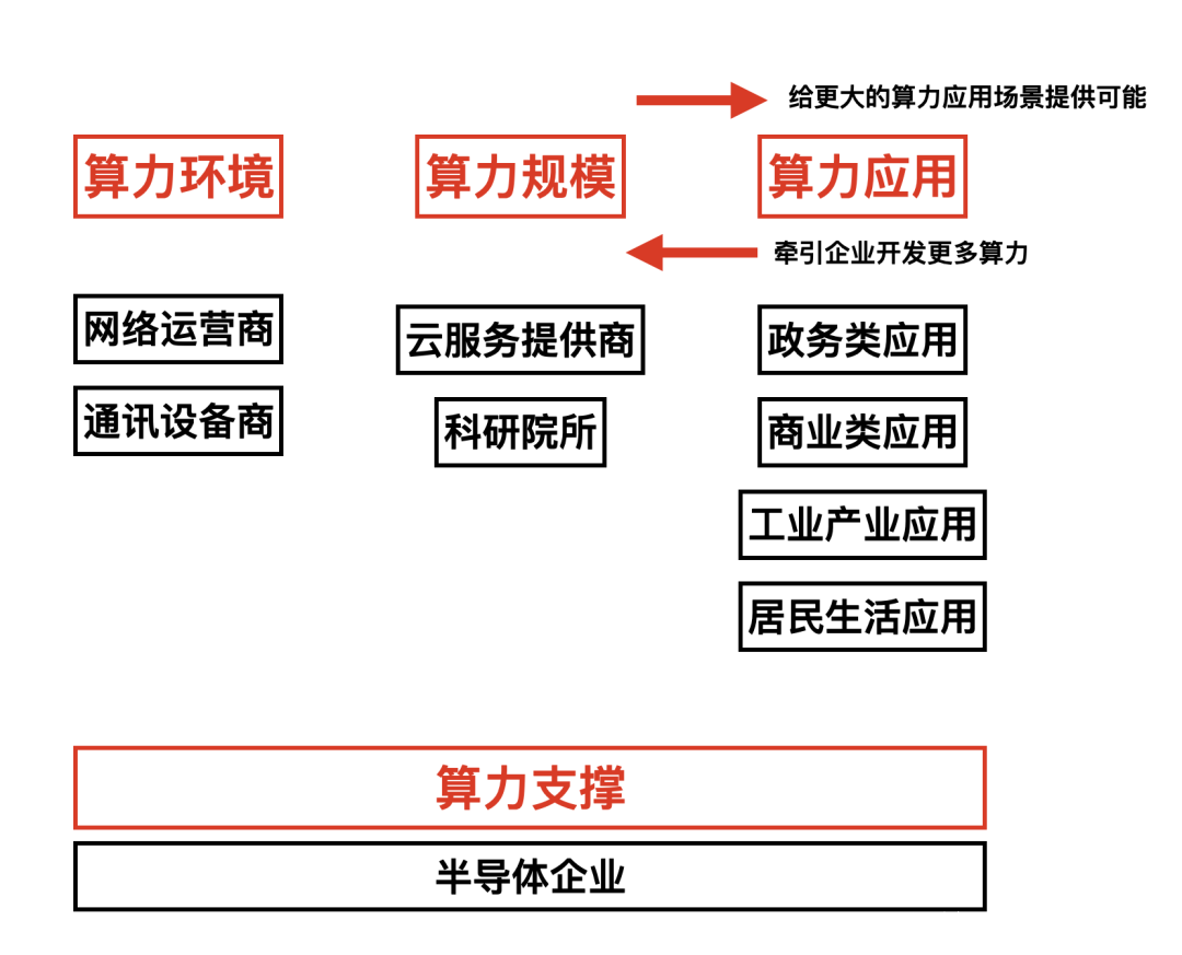 根據中國信通院的分類,一個國家的“算力發展框架”是由三部分組成的:算力規模、算力環境和算力應用。而這種分類,也恰恰與算力產業的產業鏈有相當大的重合。