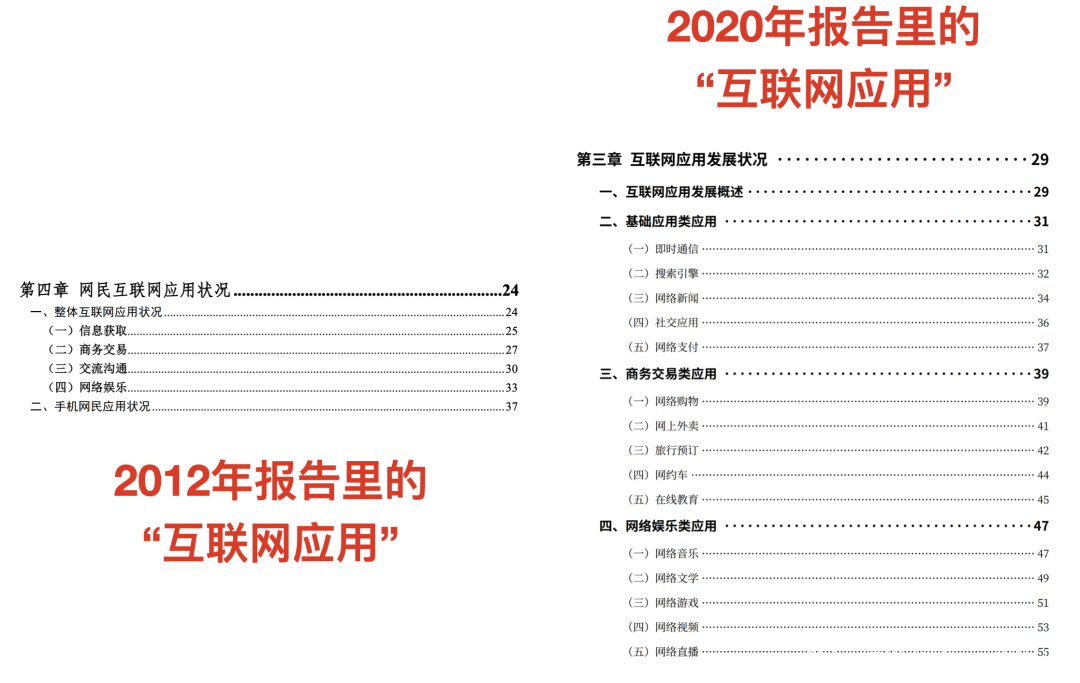 在10年前的《網絡發展狀況報告》中,“互聯網應用”部分僅有區區9頁,簡單地分成了“信息獲取”、“商務交易”、“交流溝通”、“網絡娛樂”四個板塊。而2021年的報告中,“互聯網應用”部分足足有28頁,被分成了16個具體的單元……這還不包括政務和產業互聯網的諸多應用。