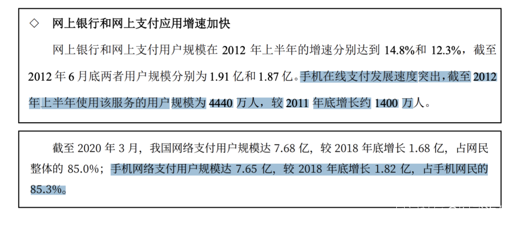 對比10年前,2012年中國只有5.3億網民,手機網民只有不足4億,網民每週上網時長只有20小時,中國網上支付的用户才1.87億人,使用手機在線支付的也只有4000多萬人。