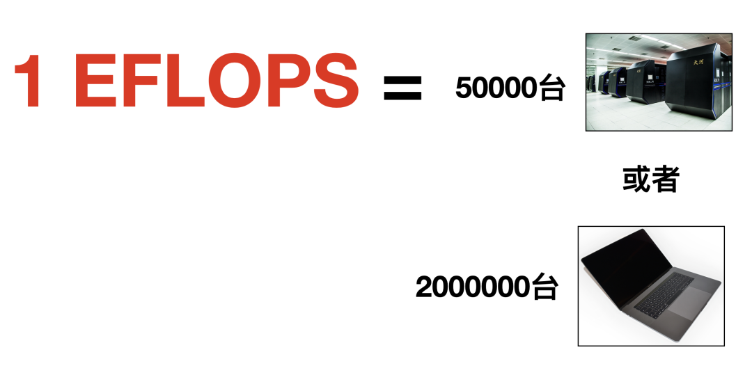 這個計量單位有多恐怖呢?不用太多,1 EFlops的算力,就等於5萬台“天河2A”超級計算機或者200萬台主流筆記本電腦同時開動的算力輸出。