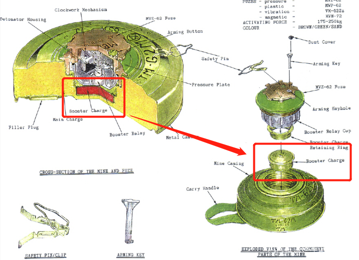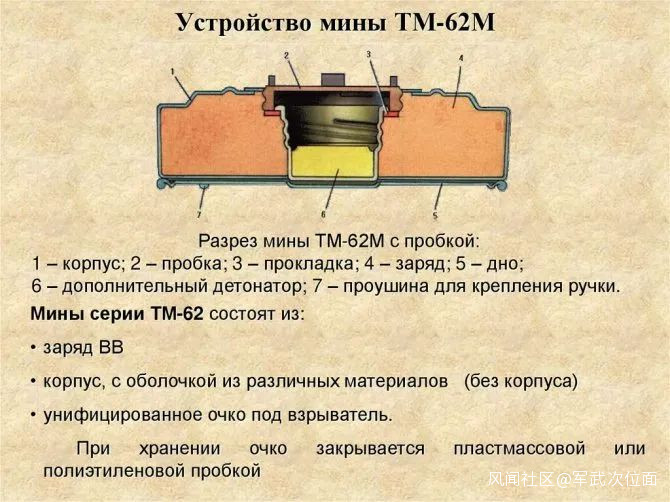 所以,即便是一個負重30公斤的成年男性士兵,總重也就100kg左右,完全不足以觸發反坦克地雷的壓發引信,但是若是這個士兵再皮一下,正好在反坦克地雷上蹦躂了一下,落地時如果對地壓力達到2倍體重,就很有可能引爆一顆反坦克地雷了,所以TM-62M是裝有延時啓動裝置的,埋完後就算非要在地雷上跳幾下夯夯土,只要膽子大也未嘗不可。