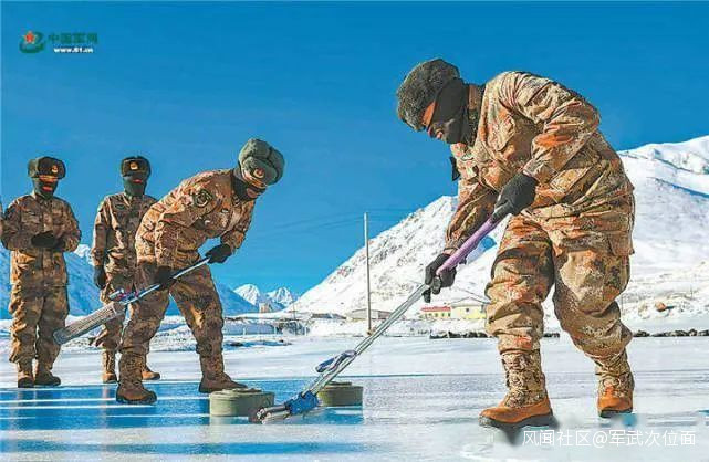 ▲邊防戰士拿反坦克地雷玩冰壺比賽