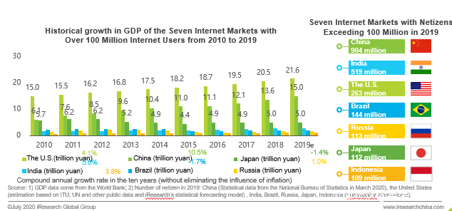 中國互聯網市場規模僅次於美國,網民數量全球第一,資料來源:艾瑞諮詢