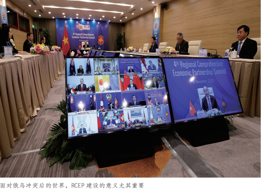 **面對俄烏衝突後的世界,RCEP建設的意義尤其重要。**2022年開始生效的RCEP是當前全球最大的自由貿易區,覆蓋世界人口的30%、全球GDP的29.3%和世界貿易的27.4%。而中國又是RCEP中最大的經濟體,佔其人口的65%和GDP的一半。從市場份額來看,中國的進出口貿易總額佔RCEP的一半,是RCEP的最大市場。**從產業鏈來看,中國擁有全球最大的重化工業體系,整體上處於RCEP產業鏈的中上游,可與RCEP其他成員國形成上下游互補關係。這決定了中國不會與RCEP成員國發生正面的產業競爭,反而將為RCEP成員國的產業鏈和供應鏈安全及延展提供了有利條件。**如果RCEP成員國共同發揮好中國這一獨特優勢,將使RCEP成員國的合作深化到產業鏈和供應鏈等微觀層面,而不再僅僅侷限於傳統國家層面投資貿易自由化的宏大敍事。反映在實體經濟上,因產業鏈各環節相互銜接,RCEP將不單是國家之間的官方承諾,而且還會成為各成員國企業的行為約束,並相應地形成自律性的商業秩序。反映在金融活動上,供應鏈各環節的相互需要,不僅將使RCEP各成員國之間的中間貿易不斷擴大,而且也將為糾正“貨幣錯配”的本幣化供應鏈金融創造條件,併為保障區域性金融安全的貨幣制度奠定基礎。