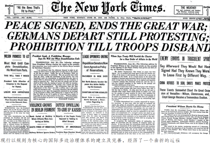 **現行以規則為核心的國際多邊治理體系的建立及完善,經歷了一個曲折的過程。**自地理大發現後,民族國家開始形成,相應地建立了以主權、平等為基礎的民族國家國際關係準則,即威斯特伐利亞體系。隨後,經過19世紀初《維也納和約》關於正統主義、均勢原則和補償原則的補充,確立了戰爭後果應指向和平的指導思想,完善了威斯特伐利亞體系。然而,戰爭的後果應指向和平並不必然防止戰爭的重演。這不僅反映在“一戰”的爆發上,而且更深刻地體現在《凡爾賽和約》的後果上。