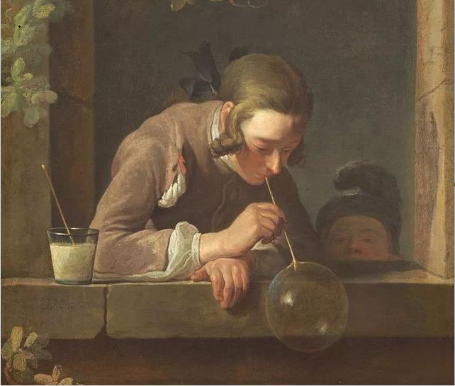 法國畫家夏爾丹(1699—1779年)所作的《吹肥皂泡的少年》也是一幅透露深意的繪畫作品。