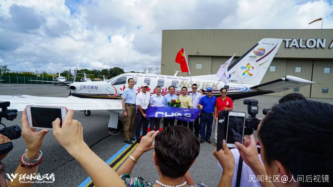 🟧 張博第一次環球飛行,紐約華人華僑接機團在到達機場為“環飛”團隊舉行歡迎儀式,打出“紐約華人飛行俱樂部”的旗幟。