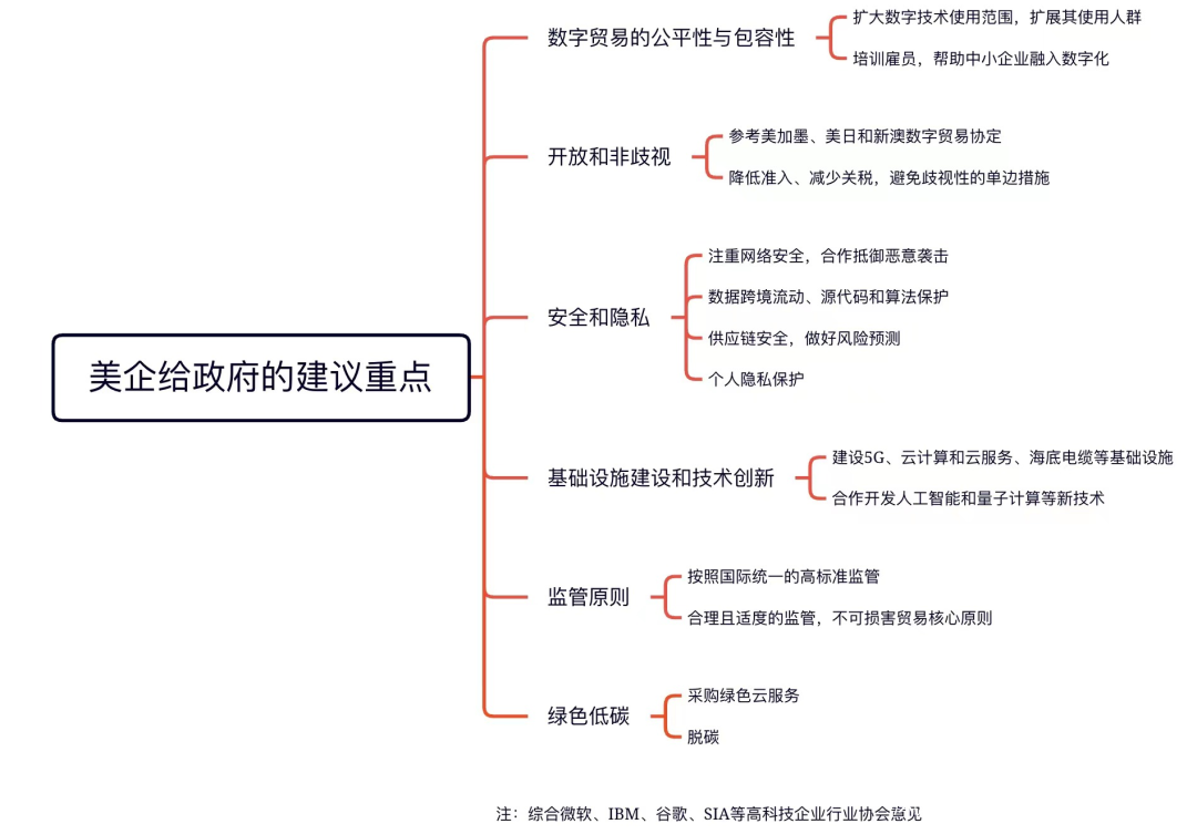 科技巨頭如谷歌、微軟和IBM,則把重點放在數字貿易的公平性與包容性,開放和非歧視,安全和隱私,基礎設施建設和技術創新,以及監管標準和綠色可持續等方面。