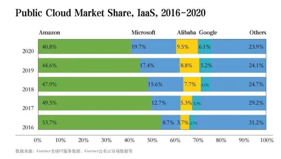 根據統計數據顯示,2016至2020年,微軟增長了11%的市場份額、阿里增長了5.8%、谷歌增長了3.4%,而亞馬遜減少了約13%的市場份額。可見,微軟、阿里以及谷歌正在不斷瓜分着亞馬遜的市場份額。