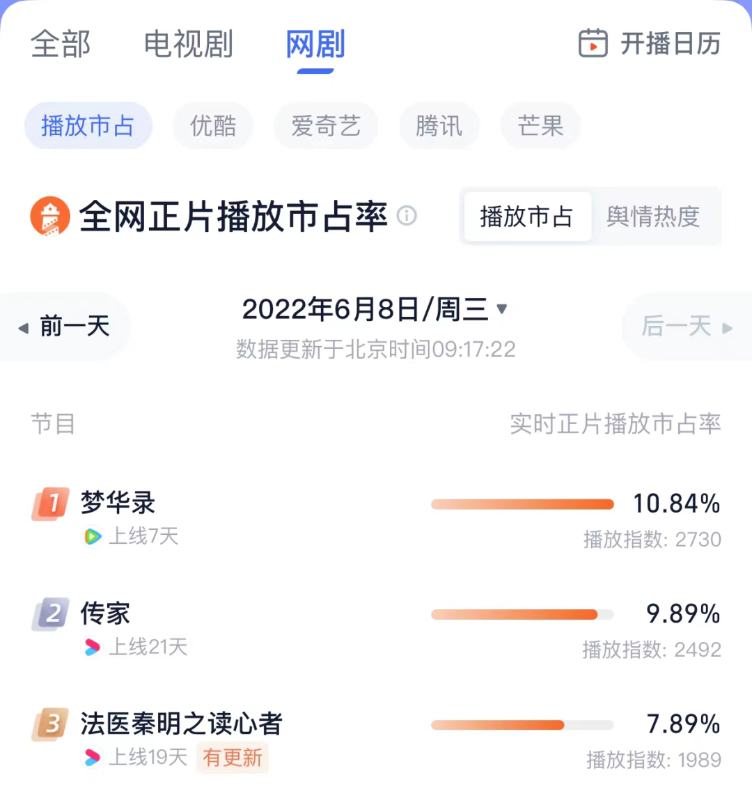 接檔《重生之門》,《法醫秦明之讀心者》在優酷懸疑劇場已經上線超過半月。燈塔專業版顯示,該劇以7.89%的正片播放市佔率位列總榜第四、網劇榜單第三,德塔文景氣指數也穩居前十,證明了“法醫秦明系列”的價值。