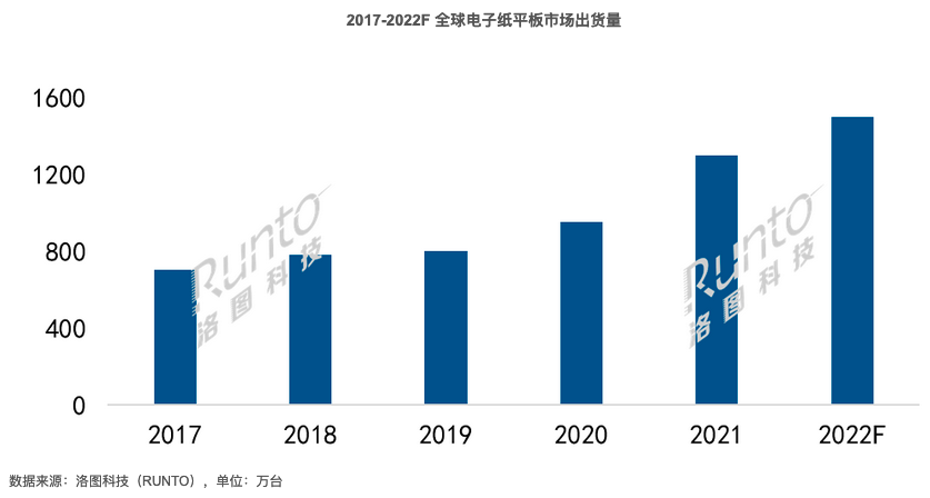 據洛圖科技(RUNTO)數據顯示,2021年,全球大尺寸墨水屏平板(含閲讀器、辦公本、作業本等產品)出貨數量達1300萬台,2022年出貨量將達1500萬台,同比增長超15%,到2025年,預計墨水屏終端市場規模能達到723億美元,五年複合增長率高達59%。