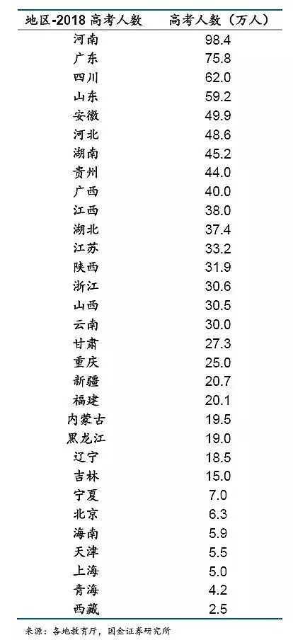 以2018的數據來看,河南近100萬考生,廣東75萬,山東&四川&安徽也都是50萬+的級別,但西藏,青海,上海等地高考人數不足5萬。