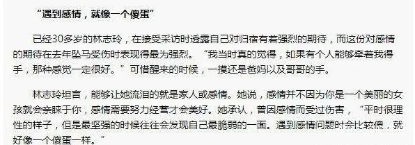 蔡康永一句話戳穿了她: “我不認為林志玲是情商很高的人,她抹殺了自己的情緒,總掛着笑臉、温柔待人,這樣太累了!” 在林志玲優雅美麗的外表下,説話做事滴水不漏的高情商下,隱藏的其實是一顆疲憊脆弱的心。