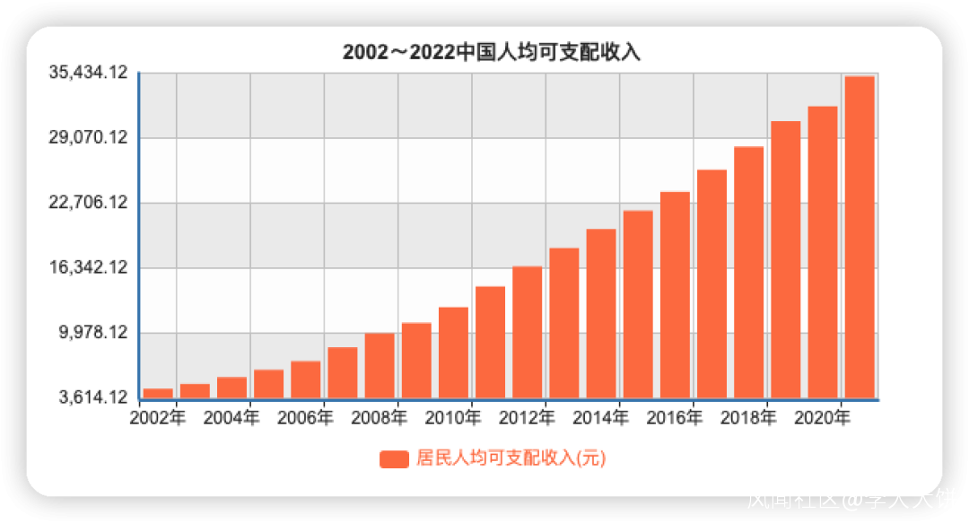 而這些年裏,**中國的居民人均可支配收入的漲幅,**只有 7.75 倍。