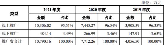 2019年-2021年,潤本生物線上推廣費用分別為3909萬、7445萬、1.03億,佔推廣費比重為96.35%、96.54%、95.51%。