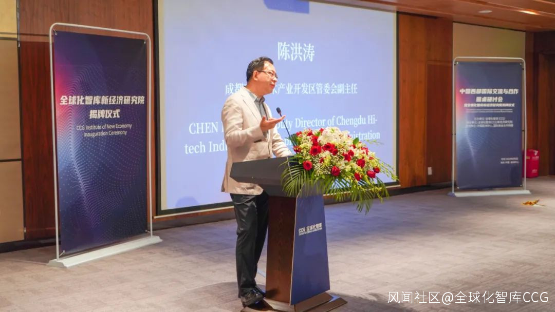成都高新技術開發區管委會副主任陳洪濤在全球化智庫新經濟研究院揭牌儀式上祝賀全球化智庫新經濟研究院成立,期待全球化智庫新經濟研究院能夠為成都新經濟發展貢獻智慧和力量。