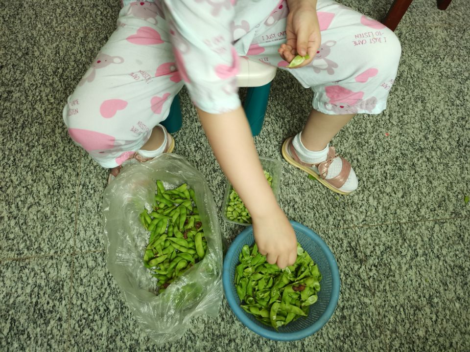 吃完早飯,小寶搬來了一張小椅子開始剝豆子了。我則繼續坐在一旁悠哉地看書。沒過幾分鐘,小寶的“幺蛾子”出洞了,“怎麼這麼硬?!”小寶先是大聲抱怨,見我扭過頭去看她,她似乎要向我證明“豆莢的確很硬”而擺出一副用指甲使勁掐的架勢,一邊“用力”掐,一邊口中配以“嘿哈嘿哈”的勞動號子。