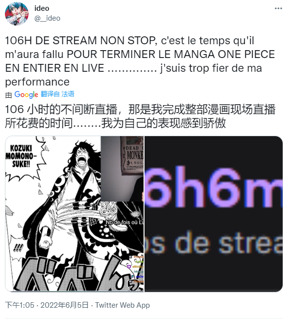 只是湊巧的是,上週一位法國的粉絲似乎就已經提前體驗了一遍尾田未來的工作生活:他花了106個小時又6分鐘,直播看完了一遍從第1話到1051話的漫畫內容。