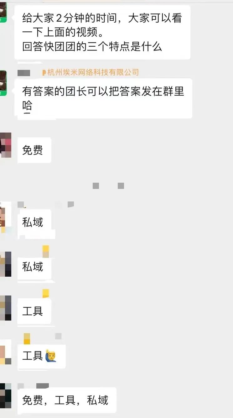 在李潔所在的微信羣中,一節“團長”培訓課程結束,快團團運營提問道:“快團團的三個特點是什麼?”羣員們爭相答覆,一名羣員給出了正確答案:“免費、工具、私域”。