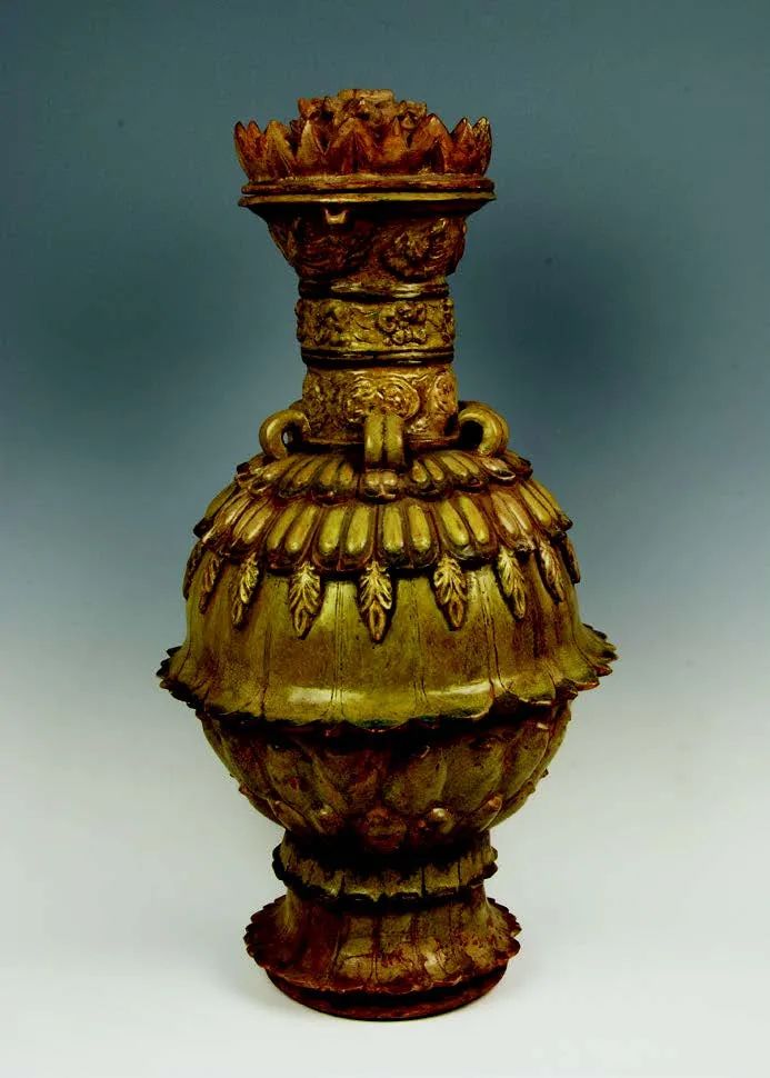 1972 年出土於南京麒麟門外靈山的一座南朝墓中。尊高 85 釐米,高脖,圓腹,圈足外撇,造型端莊宏偉,是目前我國南北朝時期同類器物中最大、最精美者,被稱為“青瓷之王”。尊的最上部為形似僧帽的蓋子,蓋頂中央有一方形鈕,鈕的四周堆塑了肥厚短小的覆蓮兩層,蓋子邊緣部分豎立了一週三角形鋸齒狀變形蓮瓣;蓋子為子母口,做工講究。尊的頸部為長喇叭口形,口外有對稱的橫系一對;頸部以凸弦紋間隔,分為三段,上段貼飾五位飛天,中段堆塑了六個人物形象(一説為熊),下段貼飾二龍戲珠和忍冬等圖案。肩部有六個橋形豎系,寬厚結實。上腹部模印了兩週重瓣覆蓮,腹部中心位置是一圈拉長的蓮瓣紋,蓮瓣下垂,瓣尖向上翹卷,蓮瓣的上部還貼附了一圈葉型紋飾。腹下部飾有兩層仰蓮紋。足部飾為兩層覆蓮紋,覆蓮向外翻卷,與腹部中間的覆蓮紋形成了起伏的狀態,為蓮花尊增添了動態美。