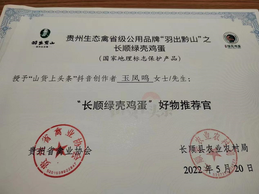 除了為家鄉帶貨,玉鳳鳴在抖音“山貨上頭條”項目的支持下,還為國家地理標誌保護產品貴州長順綠殼雞蛋帶貨,長順縣農業農村局授予了玉鳳鳴“長順綠殼雞蛋”好物推薦官的榮譽稱號。