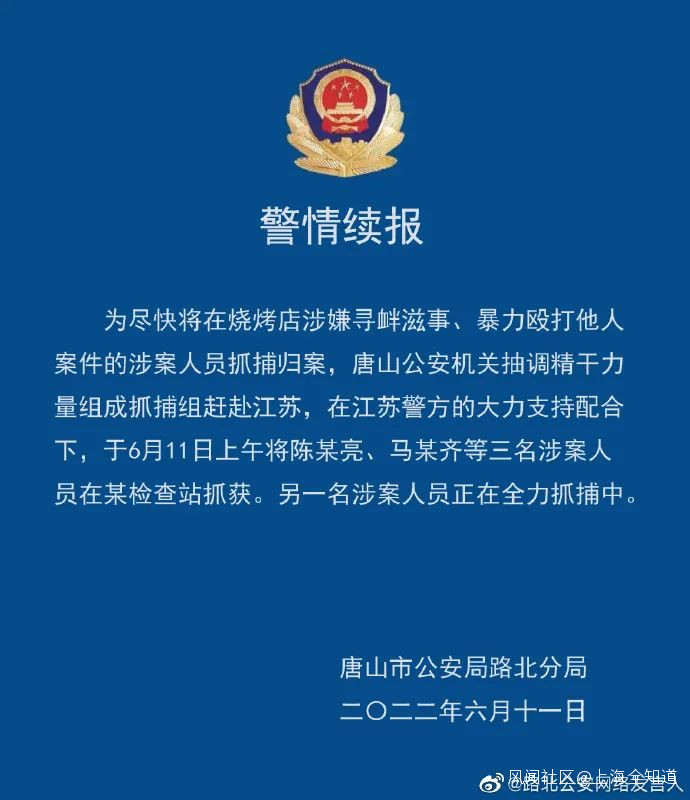 6月11日上午,唐山燒烤店打人案件又有3名外省籍涉案人員落網。