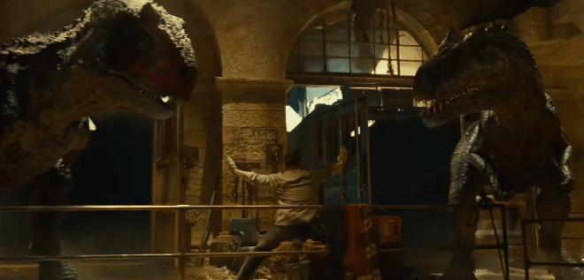 連接上一部結尾,小女孩打開“監獄”大門,恐龍進入人類世界。