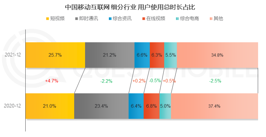 這也指向了未來的“人貨場”變革之路:當消費者的生活必需品得到較好滿足後,以迎合情緒、興趣、偏好為主的非必需品決策鏈路更短,在興趣電商的貨架上會有更好的呈現效果。Quest Mobile顯示,2021年在用户使用時長方面,短視頻已超過即時通訊,佔比達25.7%。