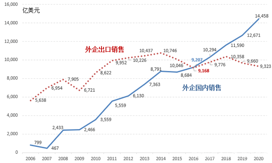 我們看到2006年的時候,外資企業在中國的銷售額,只有800億美元不到一點,而出口的金額有5600億,出口是內銷的7倍。到了2016年持平,到了2020年,外資企業的內銷已經達到1.4萬億美元,出口只有9千億美元,所以IN CHINA FOR CHINA這樣的戰略已經確立。