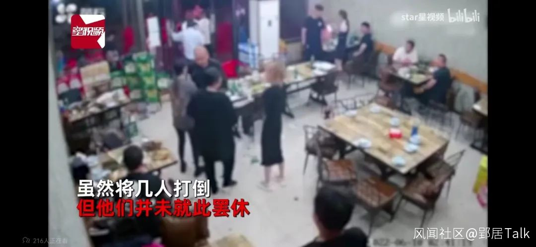 而且剛開始這些人去毆打女性的時候,我還看見有旁邊桌子的男性進行了躲避,在室內開打以後,周圍多數人也就是茫然的看着,沒有任何反應。