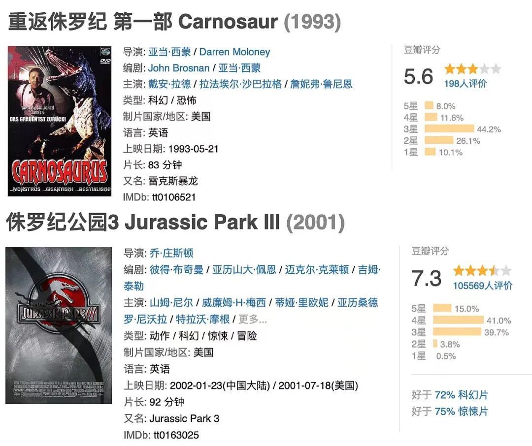 此類很難記住名字的影片也有不少:《被時間遺忘的土地》(2009)、《恐龍侵襲》(2013)、《三疊紀世界》(2018)……它們的豆瓣評分都在3分-4分之間。