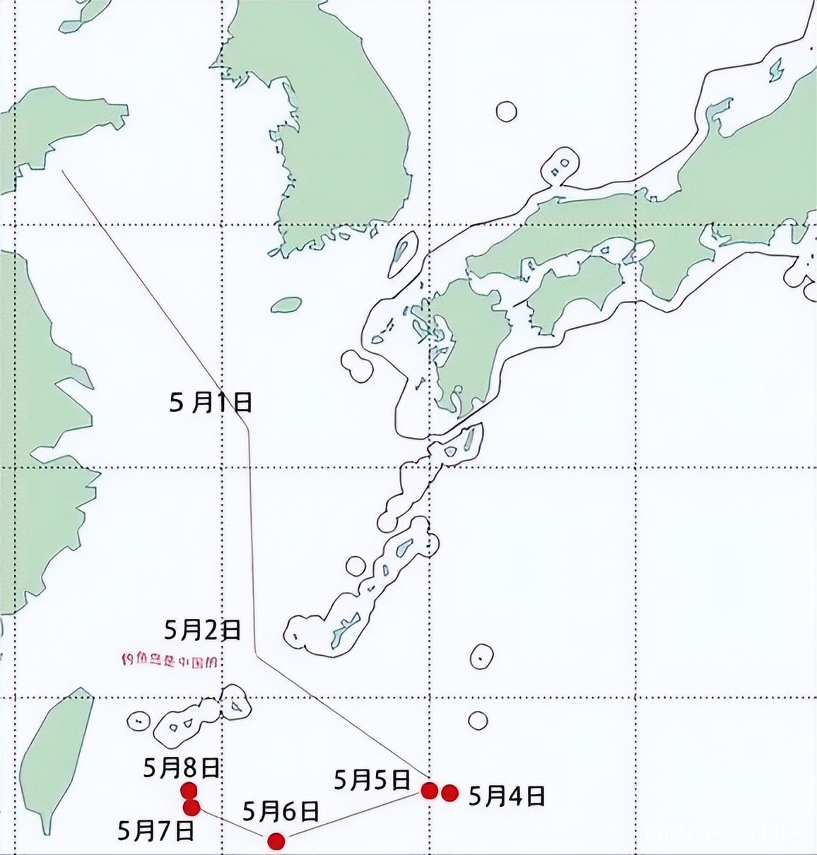 ▲此前日方公佈的遼寧艦行動路線