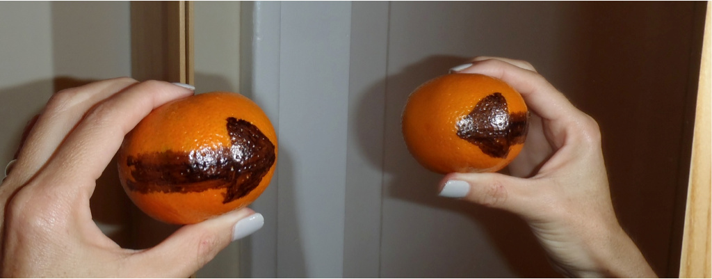 圖 14:如果橘子沿着箭頭的方向旋轉,那麼鏡中的橘子會沿着鏡中箭頭的方向旋轉:鏡中的旋轉方向和真實世界中的旋轉方向是相反的。橘子當然可以沿任意的方向旋轉,然而如果我們把橘子換成一個向上運動的中微子,那麼它的鏡像將會是一個看起來不應該真實存在的粒子。