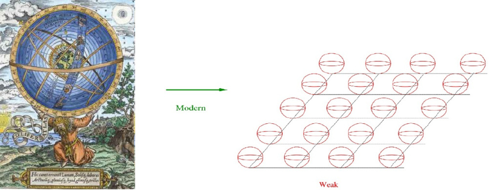 圖12:左邊是阿特拉斯擎着“天球”;而右邊則是一組球體,其對稱性決定了弱力。古人只在每顆行星上有幾個球體,在某種意義上,現在的我們每個時空點有一個球體。