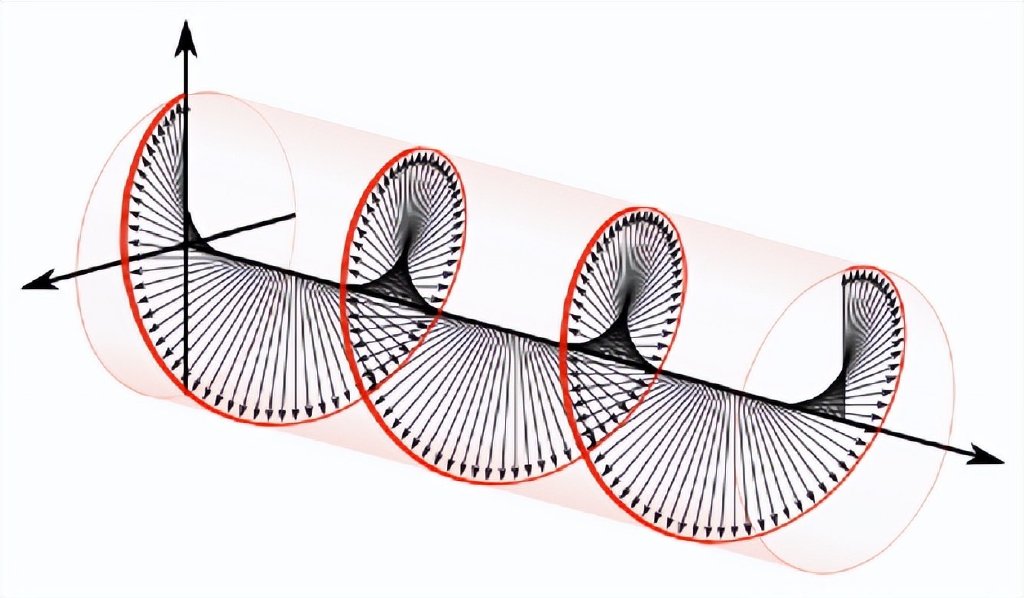 圖 13:電磁波兩種偏振態的示意圖。在兩圖中,電磁波沿着向右的箭頭傳播,旋轉的小箭頭表示電場強度在某一瞬間的方向。上圖表示一個左手螺旋的圓偏振光,下圖是右手螺旋的圓偏振光。