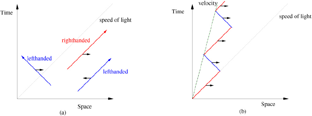 圖 15:(a) 中展示了無質量的左手和右手電子,黑色箭頭表示電子的自旋方向,它的手徵性取決於其自旋方向和運動方向的相對關係,這裏兩條藍線表示左手電子,它們的運動方向和自旋方向相反。(b) 中展示了一個“有質量”的電子,在希格斯場的作用下,它在左手和右手狀態間反覆轉換。