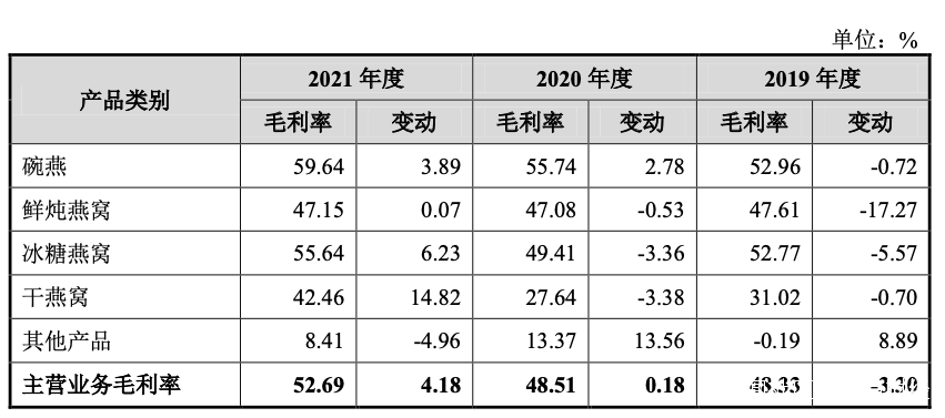 分產品來看,碗燕產品的毛利率分別為52.96%、55.74%和59.64%;鮮燉燕窩的毛利率分別為47.61%、47.08%和47.15%;冰糖燕窩的毛利率分別為52.77%、49.41%和55.64%;幹燕窩的毛利率分別為31.02%、27.64%和42.46%。