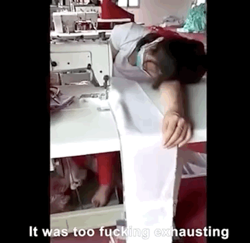 在流水線上,沒有人會互相交談,每個人都在不眠不休地重複着手裏的動作。有人疲憊到睡着在工作台上,手邊的機器卻還在持續運行。