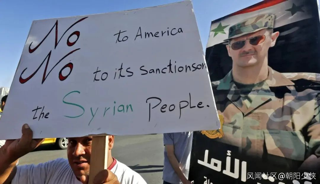 ▲2020年6月,在敍利亞蘇韋達市,一位市民手持“敍利亞人民:對美國説不,對制裁説不”的標語抗議。