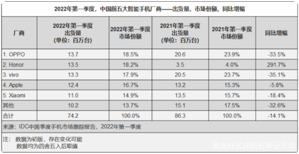 2007年,OPPO開始切入功能手機市場,2011年轉型做智能手機,以高價格、高利潤、極高的三四線城市市場佔有率成為中國智能手機行業的頭部玩家。2016年,OPPO成為中國區手機出貨量第一的手機品牌。在2017年-2019年間手機廠商“貼身肉搏”的慘烈競爭中,OPPO每年的智能手機銷售量都超過了1億台。據IDC公佈的數據,2022年第一季度國內智能手機銷量排行榜,OPPO以1370萬台的出貨量佔據首位,榮耀和vivo緊隨其後,蘋果卻身居第四;在全球市場,OPPO以2740萬台的出貨量排名第四。