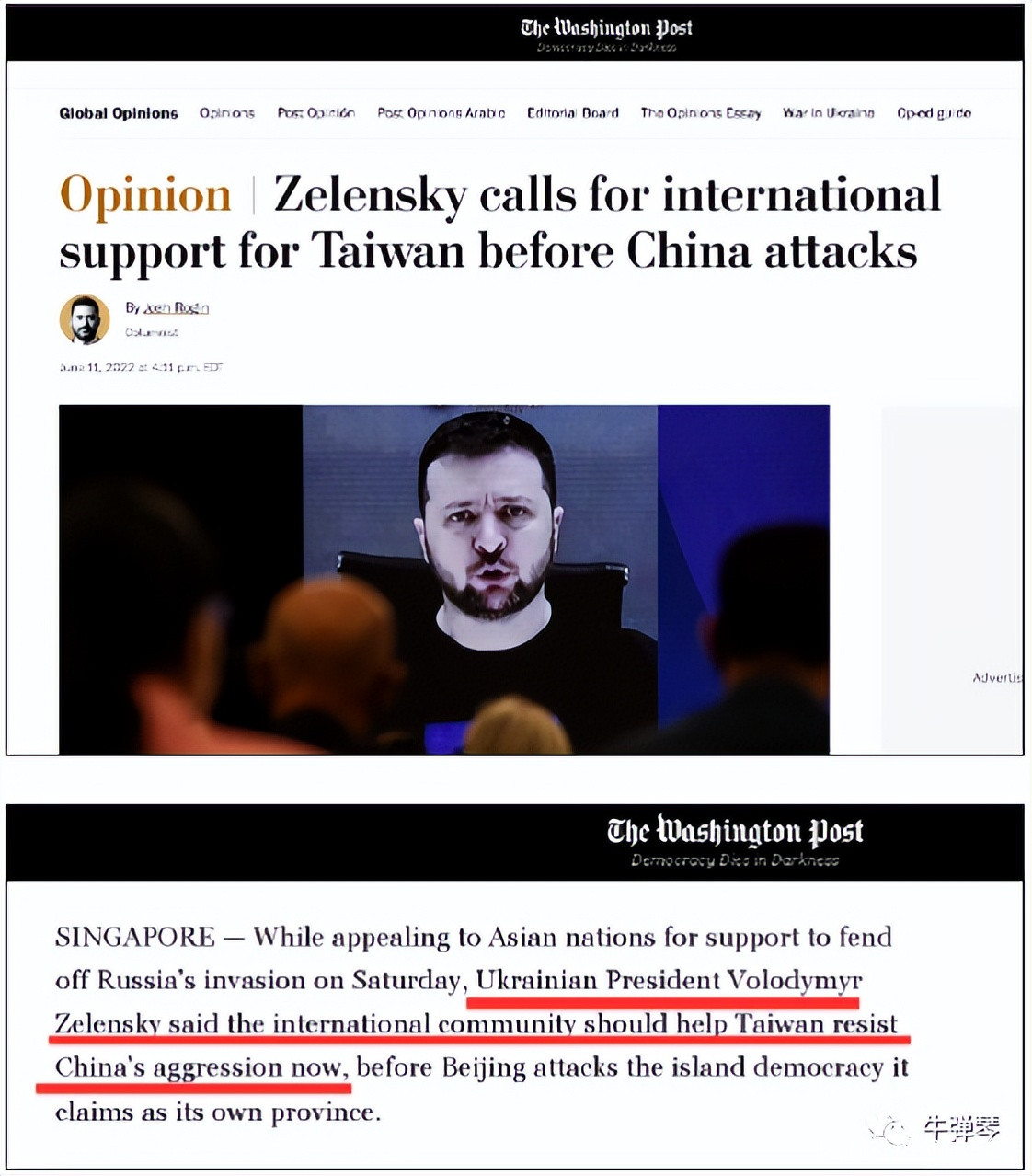 而且,這個坑,還與我們中國有關。因為,《華盛頓郵報》最近一則報道的標題就是:澤連斯基呼籲,在中國發動攻擊前,國際社會應保護台灣……
