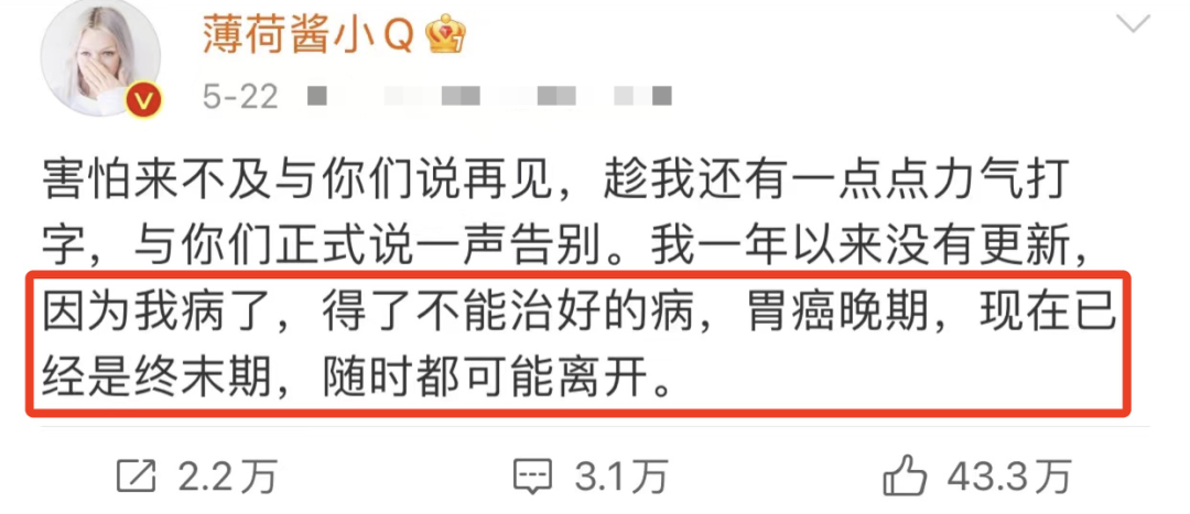 小Q因患胃癌發文道別的消息一出,全網譁然。