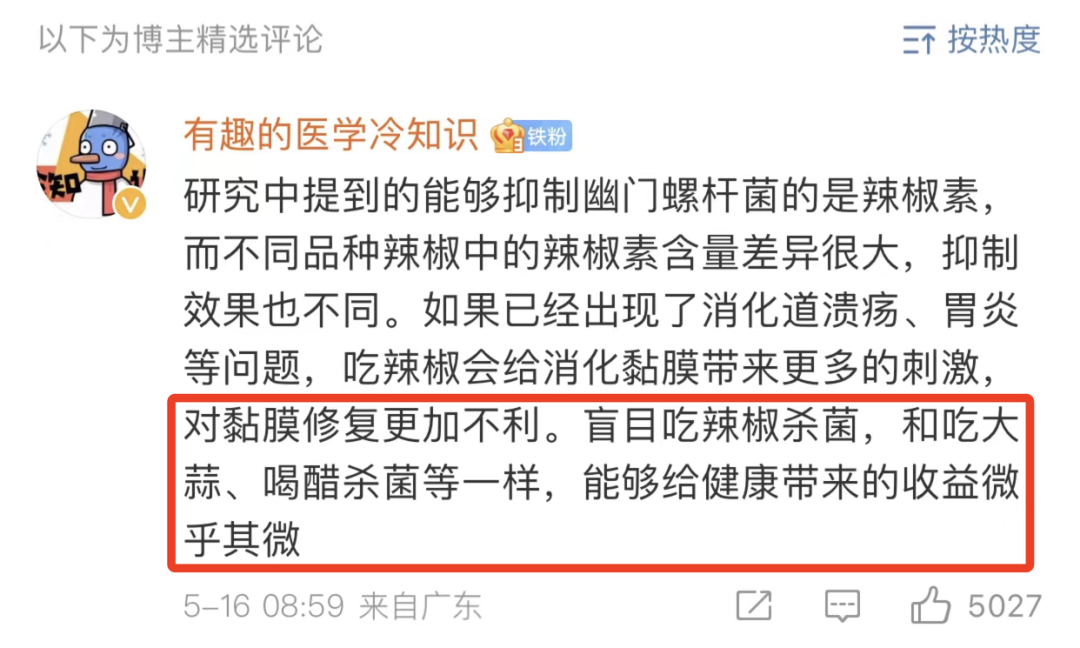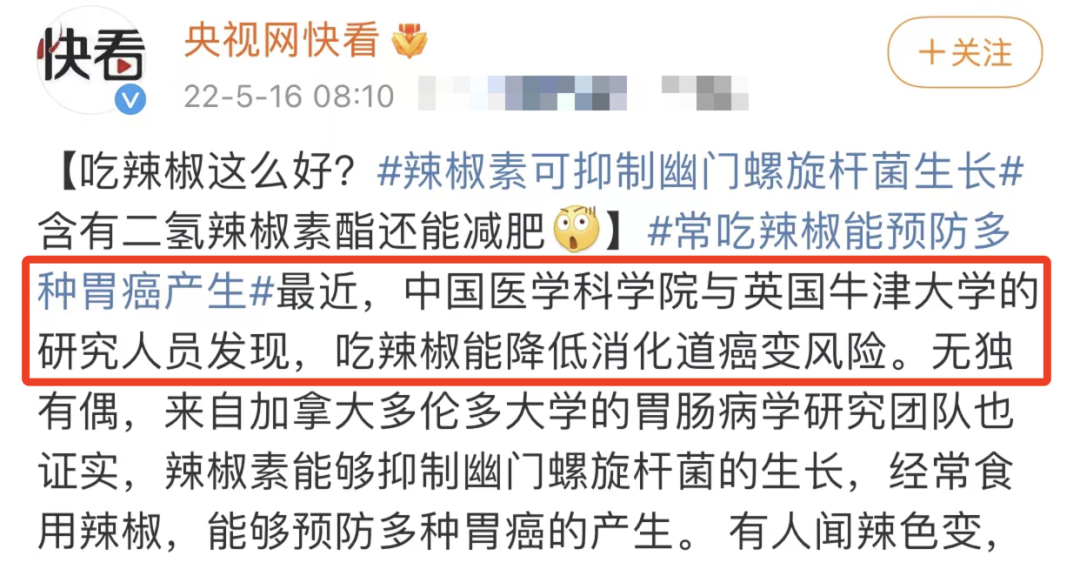 例如之前有個報道説,辣椒素不僅能抑制幽門螺旋桿菌生長,甚至還有減肥的效果。