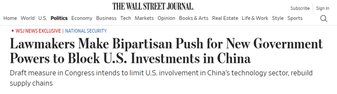 此前,美國限制了美國實體以及個人在金融市場上對一些被拉入“黑名單”的中國公司的投資。但《華爾街日報》看到的這項新的法案,開始將美國對外投資的限制延伸向“在華建設工廠”等綠地投資領域,甚至包括風險投資和私募股權領域的對華投資。